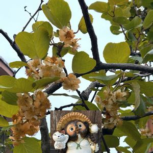 【今日のお花:キウイ】 9月に入りましたね😊 今日のお花のpicは5月のモノで ご近所さんです🥝 葉っぱが、ハートでカワイイ💚 朝散歩で、お店の前に有ったタヌキさんが ニャンコとカエルを連れていたので 皆んなで🏷️どたま祭りです! 今月もよろしくおねがいしまーす🤗