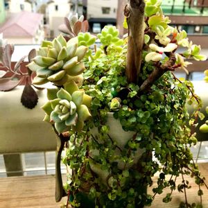 寄植え始めたばかりの頃のはちです。 百均の子ややっとうちで増えてきた子をを混ぜながらつくりました。