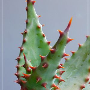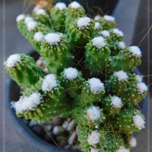先端の白い部分がかわいいモンストサボテン。奥の方の一本だけ、わさわさと細い棘を生やしてる。