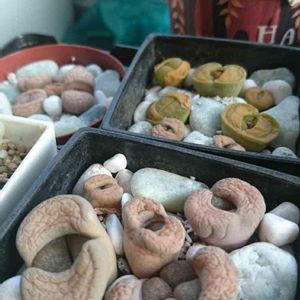 今日お迎えした子(*´ω`*) オブツーサちゃん と 脱皮中の双子ちゃんアルビニカ♪♪ オブツーサちゃんの触り心地が最高です((* ´艸`)) 店長さんがリトープスの種の取り方とかいろいろ教えてくださったので、アルビニカちゃんに種ができたら育てようと思います❤️