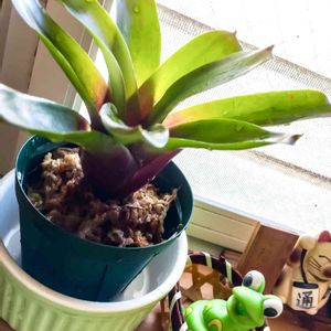 ヤバっ! 中心の 葉がひろ〜ん と 弱々しくなってた 室内に入れた でも、そこは 牙がある多毛一族の 縄張りだから 二階の洗面所くらいしか 居場所が無い 取り急ぎ 多毛(猫)一族の水入れで すまんねぇ