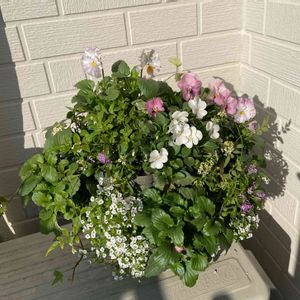 スリット型のパンビオのハンギング作りました🎶 今年はピンクと白で♡ ビオラ・白1 パンジー・ピンク2、白フリル1、 シエルブリエ・淡いピンク2、 アリッサム・白、クリーム、ピンク各1 その他、バコパ、へデラ、ハゴロモジャスミン、グレコマは庭から適当に💚 ひと苗を分解して入れ込んだアリッサムが ちょっと元気がないので、回復してくれることを期待して様子見です😑