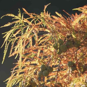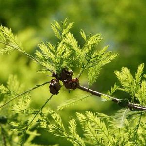 落羽松(ラクウショウ)/沼杉(ヌマスギ) 北アメリカ原産で明治時代に渡来したヒノキ科ヌマスギ属の落葉高木。沼地や川辺などに生育することもできることから沼杉とも呼ばれる。湿った場所に生えている場合は、周囲の地面から地上に出て呼吸をする『膝(しつ)』と呼ばれる呼吸根が柱状に直立することが多い。これは他の木にはない特徴で、水浸しになると根は呼吸困難になるので、根に空気を供給する働きをする。葉は、水平に並んだ鳥の羽根のように互生し、よく似たメタセコイアの葉は対生する。花期は3~4月で、黄緑色の小さな花が多数集まって10~20㎝の花房をつくり垂れ下がる。 秋に葉が小枝ごと落葉するのが羽毛がひらひら落ちる様に似ているためついた名前。 出典『樹木の事典600種』『都会の木の花図鑑』