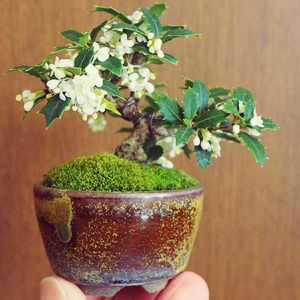 今年購入した盆栽です。「ヒイラギ」ですが、小さな花を沢山付け元気に咲いています。次の年も頑張って咲かせたいと思います。