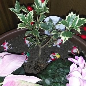 ヒイラギの根元でサンタさん達がこっそり演奏会を開いています🎅