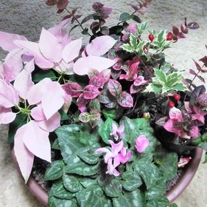 今日の収穫😆 3つで300円だったので寄せ植えにしてみました💕 ヒイラギがもうちょっと育ってくれると良いかな🌿 ピンクのポインセチアは初めてだ😄