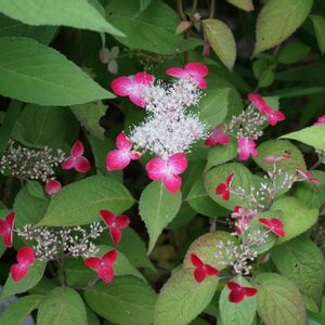 山アジサイの「くれない」だったかと思います。 背丈が低く白い花びらから深紅の赤にひっそりと変わっていく様は魅力的です。 名前間違っていたら教えてください。