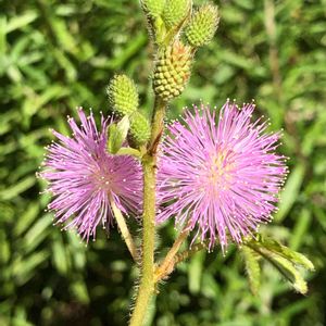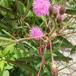 オジギソウ 別名;ネムリグサ 葉に触れるとビックリして 直ぐに閉じてしまいます😊 ボンボンみたいな花が なんとも可愛らしいです🤗