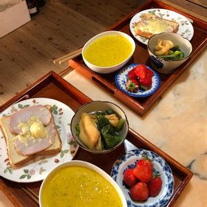 朝ご飯 食パン、手作りハム、溶けるチーズ カボチャポタージュ 薄揚げ、熊本京菜煮浸し 苺