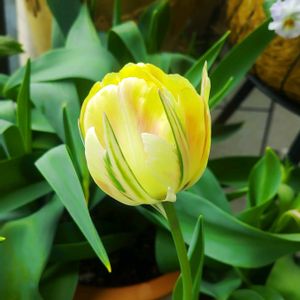 2024.3.12 黄小町チューリップちゃんが開花しました。 新鮮な黄色🟡カラー元気もらいます✨ 何ヶ月か前に育てたメリープリンス(ピンク)よりも背丈が低く、カワイイです。