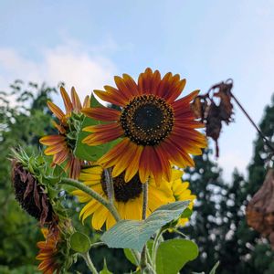 天高く咲くひまわり🌻 今年はこじんまりとさせてしまったけど やっぱり暑い夏にひまわりは欠かせない🌻😆🌻 こっちに来てこんなに暑いのも初めてかも🦆💦 それでもお庭は冬対策考えてやらなきゃよね〜🤣 ムズっ🫨