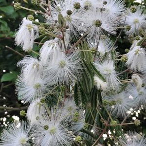 白のネムの花 夕方から咲いています いい香り〜 葉っぱは夕方から葉を閉じて寝ています