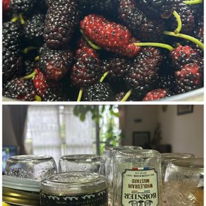 桑の実の季節到来 今年の実の数は半端ではありません いつも決まった木から採ります 大きくて枝切りが少し楽だからです 煮沸前の空き瓶が並んで待っています、、、、 今年は幾つできるかな? 花友さんよりワグワの実と教えて いただきました
