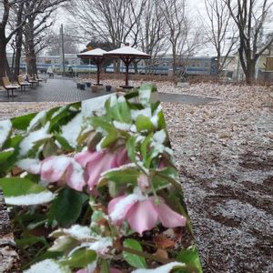 今朝の散歩 ラジオ体操始まる頃から 白い物チラチラと。 庭のクリスマスローズ 雪被って、寒そう 後ろは猫の公園 うっすら雪被ってます、 🌁⛄🌁