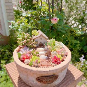 コメ返まだですが投稿失礼します😅 お花屋さんで500円でかわいい鉢を 見つけたから箱庭作ってみました💕 お家は以前にちまきさんからお土産で もらった物です。 ちゃんと植えれるようになってるの🎵💕 小石は知多の海で拾って来たもの☺️