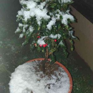 年末に買ってきた、ちぢれ万両 雪帽子を被ってます。