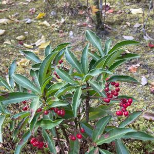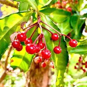雨☔でした。 久しぶりに通った道の脇に赤い実が沢山⁉️ 前は葉っぱだけだったのに。 調べたら千両だと思います。 他に、万両や百両、十両、はたまた一両もあって勉強になりました。