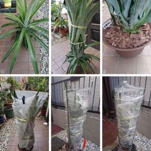 パイナップルの冬越え準備をしました。 ①2021年5月に水耕栽培から鉢に植え替えしました。 あんなに可愛かったのに、こんなに大きくなって。 ②かなり抵抗されましたが、ひもで縛りました。 あっ、手にとげが・・・ ③君は冷え性だから、ダイソーのバークチップで暖まってくれ。 ④不織布で巻いてあげるから風邪ひくなよ。 ⑤リング支柱を立て、ストレッチフィルムで巻き巻き。 これでもうポカポカだぜ。 でも、3本足だから巻きにくいな。 もう一本足して4本脚にしてから巻けば良かった。。 ⑥最後に上からビニール袋をかけて、両端を切って空気穴をあけました。 鉢の周りは太陽光で暖まるかと思い、黒のマルチシートを巻きました。 これで寒い冬を乗り切って、来年3月に元気でお会いしましょう。