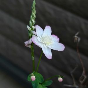 毎回沢山のいいね、コメント有難うございます。 こんにちは!! 3月になり朝の最低気温も今朝は5℃。 かなり暖かくなりました。 昨日から少しほころびを魅せてた赤花台湾バイカカラマツの最初の花が咲き始めました。 草丈は現在5センチ程度ですが最盛期には10㌢位になるかと思います。 赤花といってもほぼ桃色で花軸の長い可愛い花を着けます。