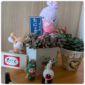 こんにちは(*´ω`*)ノ)) 1枚目 昨日、仕事から帰ると みたりんちゃんからゲリラプレ企画 当選品とオヤジ&スヌーピー( ・ ´`(●)のピック、おやつ🍪☕️💕が届いていました。 どれを植えようか迷い中ですが💦 ちょうどフェルニア(ガガさま)の花が咲いていたので仮にIN 昨日はまだ蕾だったからビックリ でもサイズはピッタリ✌️です。 でね〜ぇ 後ろのぬりかべ(2枚目)も可愛いよ〜 本当に可愛い鬼太郎とオヤジさん これからいっぱい投稿させたいです みたりんちゃん、ありがとうございました(*・ω・)*_ _)ペコリ 昨日投稿したまつぴよちゃんからの 🍓が付いたリメ鉢に先日、フラリエハンドメイドフェスタでtanikufarmさんのフォローしてると貰える エケベリアのフォーティチュアードとレッドジカを早速植えました😊 それから昨日が石の日だった事 すっかり忘れてた💦から 🏷一日遅れてめんごめんご 付けてイシコロピータン鉢とイシコロピータン 登場してもらったよ〜😁 3枚目 フェルニア、上から📱_(-ω•_パシャ 4枚目 先日、蕾だと思ってたら種が入った鞘🫛だと分かって実生の日で試しに種を蒔いてみたら芽が出たと投稿 したガガさまのその後…… 他にも蒔いてみたら発芽しまして すくすく順調に育ってます😊 オヤジおぼうぼピータン 見守ってるよ〜😊