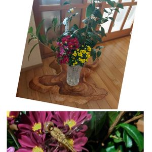 今晩は🌙😃❗ お茶の木と小菊を生けました。 夕方 畑の水槽でトンボが浮いていたので 救うと まだ 生きていたのでお家に 朝夕 冷えるので小菊にのせて お昼頃 下駄箱に移動していたので 羽も乾き 一度手から飛び立ちましたが 落下❓️😂 二度目は高く 飛んで行きました。❣️ 元気になって良かったね。🤗👋