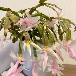 デンマークカクタス🇩🇰ホワイトベル🤍 シャコバサボテン🌵とも言う 『デンマークで改良された新しい品種で写真のような 美しい花が楽しめます』の説明に惹かれて購入😘 蕾いっぱいだったのが一週間でコンナニ咲きました🤍 蕾はイルカの頭みたい🐬 咲き進むにつれて花弁がめくれて鳥の様に 💗