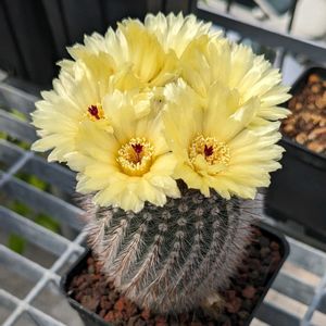 今日咲いたお花😊 1. ノトカクタス小町 昨日も載せたけど、今日は6ついっぺんに咲いたのでもう一回 2. ギムノカリキウム名無し この冬スーパーで翌日にでも処分されそうだった株。ギムノカリキウムだったから保護してきた後初めて開花。中心部がうっすらピンクの持ってなかった色で嬉しい🩷 3. ユーフォルビア剣光閣 「私も咲いてるよ」と言われた気がしてパチリ。