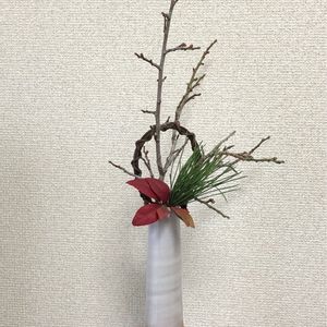 『迎春の装い』 GS花友のNさんから、お題を付けて頂きました。🎍💞 松 梅 南天 *松と梅は剪定したのを頂きました。 もう蕾がふっくらしています。 後は… 竹があれば ♪しょぉちくばい🍶♪