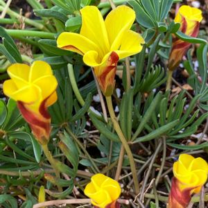 こんばんは😊 今日のお花オキザリス ナマクエンシスは、ルピナスみたいな葉っぱに黄色に赤のラインが入る可愛いお花です💛❤️💛 南アフリカ原産のパーシーカラーの黄色版といった感じです😄 オキザリスは、放っておいても時期が来るときちんと咲く偉い子だなぁと毎回感動します🥺