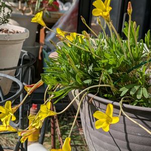 オキザリス ナマクエンシス 晴れたからよく咲きます。 向こうに水やりの片手柄杓が、転がっています。気づかなかった〜