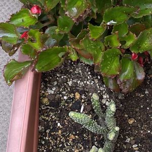 会社のプランター植えの金烏帽子 夏越しして小さな子株が上に ぽこぽこ吹いてきました お隣は先住のベコニアです 🌵 植えただけで何の世話もせず ときどき覗いて癒されるのみ🤭