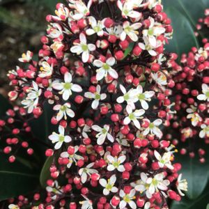 おはようございます😃 スキミアです。 ミカン科の低木です。 ミヤマシキミという日本原産の植物がヨーロッパに渡り、品種改良されて色々な園芸種が生まれたそうです。 去年、散歩コースで見つけて、ビバーナム(トキワガマズミ)に似た変わった姿の木が何か分かりませんでした。 地植えでかなり大きな株です。 色々調べて、スキミアに辿り着きました。 アズキ色の小さな粒々は全て蕾です。 春にはジンチョウゲの花を小さくしたような白い花がたくさん咲きます。😊 緑の葉っぱとこの赤い蕾が人気で、ヨーロッパではクリスマスによく使われる花だそうです。 クリスマスホーリーよりも大人の雰囲気ですね。 ここ以外ではまだ庭に植えられているのを見たことはありません。 しかし、花の少ない今の季節にこの色合いは素敵です。 ビバーナムと同じように、庭木にもいいと思います。😘