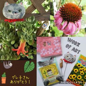グレ子さんの 《222pic達成記念‼️勝手にこっそり ゴリラ🦍プレ企画〜〜‼️》 に当選しまして😁 ↘️ *猫ピック×2種💕 豆吉似をチョイスしてくださってます( *°ω°* )ニパッ *カレルチャペックの可愛い紅茶パック(これまた可愛い猫zip袋に入ってる) *タオルハンカチ(ふわふわよ~) *早咲きミニひまわりの種🌻🌻🌻 を頂きました! グレ子さん、素敵なプレゼントありがとうございます~❤( *¯ ³¯*)❤大事にするからね❗ ヒマワリはもう植えちゃおう🎶 ↖️ピック使用例 ペンデンス🐙 ↗️今日可愛かったエキナセア ピンクのドレスっぽく咲いてるよ💗