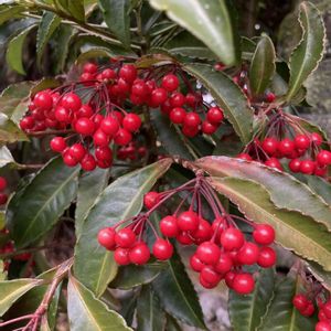 万両 師走の風が冷たい中 真っ赤に色づいていました よく見たら石の間に小さな苗が🌱