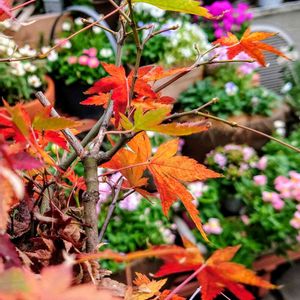 紅葉🍁の間から望む我が家の花たちですが 昨日の春一番の様な暖かい強風で殆ど散ってしまいました🥹