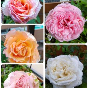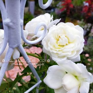 庭の薔薇🌹 昨日の夕方、急に風が強くなったので、鉢を移動して✂️ 今朝は快晴😊夕べの薔薇が随分開いていました! ホワイトクリスマス イングリットバークマン ディスタントドラムス 千日紅白