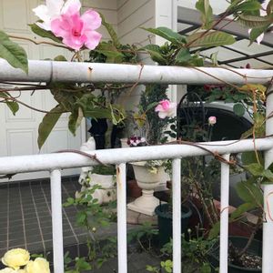 素敵な玄関にマンデビラやバラが まだ少しだけ咲いてる🥀 今日はお日様が出てないので少し冷えますね