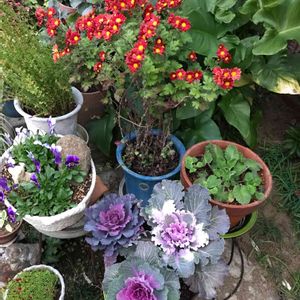 細い散歩道を通ると裏庭に植木鉢が並んでた ハボタンやキク、ビオラの植木鉢🪴