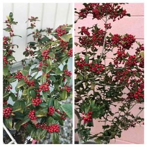 微妙に葉っぱが違います。トゲトゲのあるなし… 右)クリスマスホーリー(セイヨウヒイラギ) 左)チャイニーズホーリー(シナヒイラギ)?シナヒイラギモチ? よくわからないけどどちらもクリスマス色です🎄🧑🎄🤶