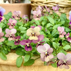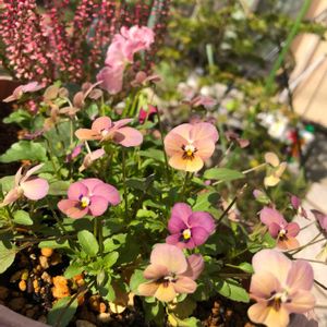1番上のが直に置いていた時はヤメクジに良く食べられて 花弁欠けてましたが…ここに置いてからは 綺麗に咲いています ちょっと渋めで小さめのお花 ビオラ タンゴアモーレさん 何故かこの子ばかりかじられていました😂 お隣のビオラ ピーチランド こちらの方が少し茎が太くてお花も気持ち大きいです 真ん中が発色の良いオレンジで気に入っています 両方共見元ビオラです🎵 真ん中 よく咲くスミレ、虹色すみれ2種類 どのお花にもイエローが入っています💛 下 見元ビオラ ダンディーチャップリン2種類 右側 淡いパープル、左側 濃いめのパープル 中にはイエローに咲いたりしてカラフルです お顔のしっかりしてるお花と薄いお顔と色々で面白い😀♥️ こちらのお花も茎が細めなので花付き抜群に良いです🎶