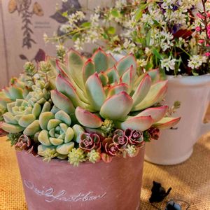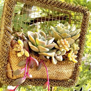 連投失礼致します…🙇♀️ こちらが2つめの寄植えです… 家の中で使っていた籠にジュートを敷いて鉢の代わりに…❇︎