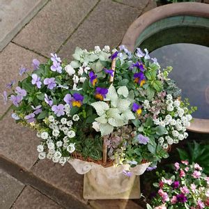 カゴアレンジ ホワイト×ブルー×ライトグリーン 植えてから1週間目 ビオラが太陽の方へ向いてしまうので、(部屋から見ると後ろ姿しか見えないので)鉢を回しても大丈夫なようにお花を配置しました🏵️