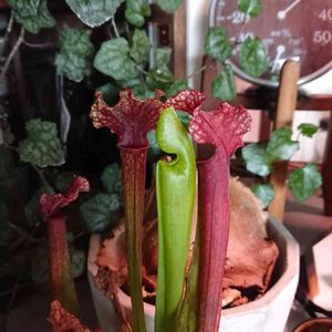 今日数ヶ月ぶりに近所のHCに行ったら植物コーナーが驚くほど充実してた💡 以前は観葉植物なんて気持ち程度にしかなかったのに、アガペやサンスベリア、ビカクなんて一万超えの大物まであってびっくり😲 特に欲しい物はなかったけどたっぷり目の保養をしてきました😁 でHCで購入のサラセニアがぐんぐん成長✨ パッか~んが待ち遠しい🎶 不思議なのはナギナタ状態で生えてくる壺と、もともとコブラの頭のような形のまま成長してくる壺二種類あること💡 どういう違いなんだろう🤔