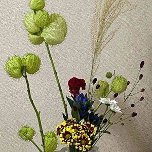 『風船唐綿』『ガーベラ』『ケイトウ』を生けました。 生け花で少し心が安らぎます🍀