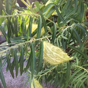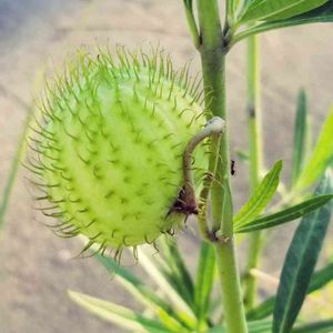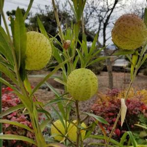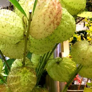 北九州市総合農事センターにて 【フウセントウワタ(風船唐綿)】 南アフリカ原産のキョウチクトウ科の低木。 トゲのある風船のようなユニークな実を付ける。 花期は6月下旬~9月。 上部の枝の葉の付け根から花序を出し、小さなクリーム色の花を数輪まとまって下向きに咲かせる。