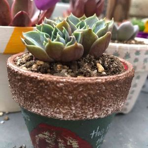 前回のマルシェで鉢がコロコロ転がって… ヒビ入ったの😭 売り物には❌だけど全然使える〜😆 グリーンの渋い鉢に同系色の多肉をインしてみました。