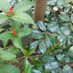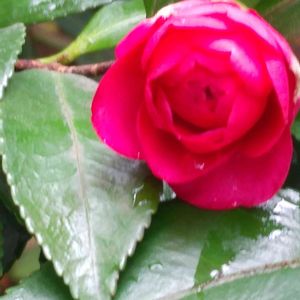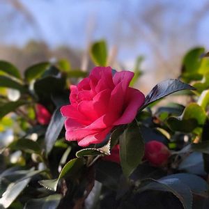 カンツバキ(寒椿) サザンカと椿の交雑種 八重咲の濃い紅色の花が特徴💕 枝が横に広がるので高さは1メートルくらいにしかならないそうです(小高木)