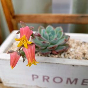 エケベリア 花茎は短く咲いた。 ハッキリした色のピンクにイエローこのコも小さいのに咲いてくれた。