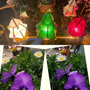 食後、夜の散策中に〜 🌙✩︎⡱クリスマス🎄の ✨ステンドグラス🪔ランプ✨が 綺麗でした✨⸜(´ ˘ `∗)⸝💕 パンジー💜も近くに咲いていて〜 綺麗でした(*´꒳`*) 白いお花は〜ヒナギク🌼かなぁ〜⁈😊