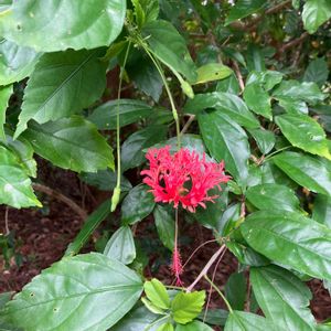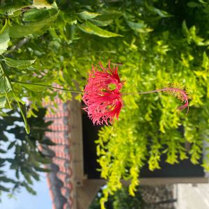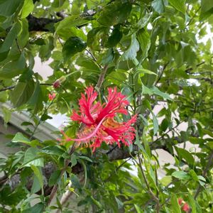 こんにちは~😆 ☁️ってますが気温高め😵💦 熱中症に気をつけて💓 ~風鈴仏桑花(フウリンブッソウゲ)~です🌺 今朝、咲きました🎵 美しいお花で 凄く嬉しいです😍💓 5枚の花弁に深い切れ込みが はいって反り返って、 全体の形は 風鈴のようです🎐 ハイビスカスの交配種の 一種になった原種です。 アオイ科フヨウ属 非耐寒性常緑低木 開花期 : 6~10月